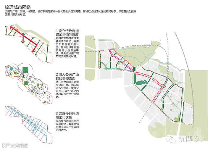 A、设立特色廊道增加绿色资源的可达性。将城市主轴打造成主要生活性街道,再借力东北侧的大型公园,延伸出绿色廊道。