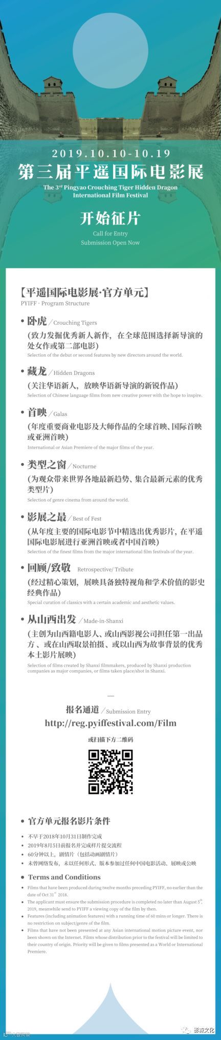 平遥国际电影展由中国电影工作者贾樟柯发起创立,马可·穆勒担任艺术总监,第三届平遥国际电影展将于10月10日至19日在位于山西晋中平遥古城内的平遥电影宫举行。目前,第三届平遥国际电影展面向全球的征片工作正在进行中,目前已经收到多部海内外报名影片,征片将于2019年8月5日截止。