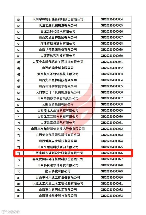 2023年11月27日,全国高新技术企业认定管理工作领导小组办公室公布了“山西省2023年第1批高新技术企业备案名单”,大地控股所属全资子公司山西省城乡规划设计研究院有限公司(简称“省规划院”)成功通过国家高新技术企业认定。