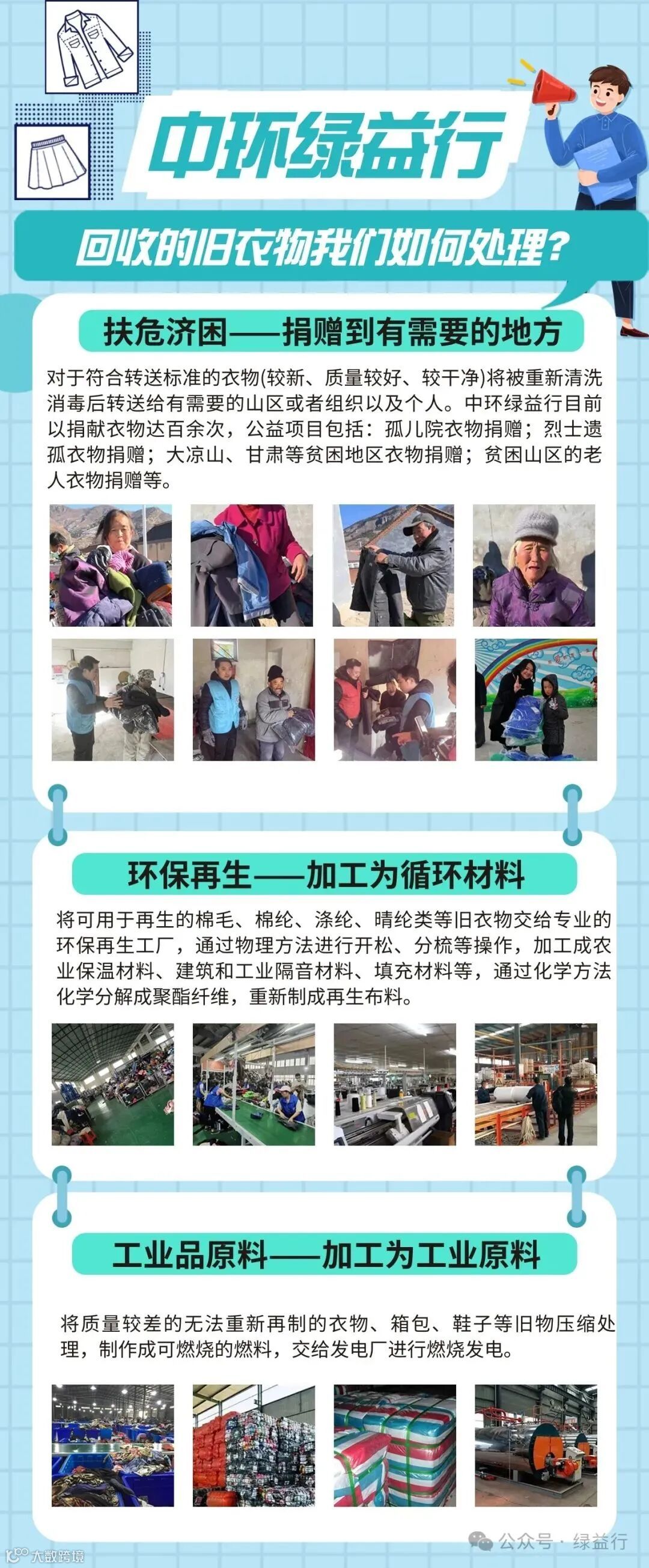 中环绿益行旧衣回收 中环绿益行(北京)环保科技有限公司,中华志愿者协会志愿者之家,服务于节能减排,环保科技项目的志愿活动。现阶段致力于废旧纺织品利用、处理、再生的环保科技型企业,公司发展理念:始终坚持"绿色行动,益满天下"。