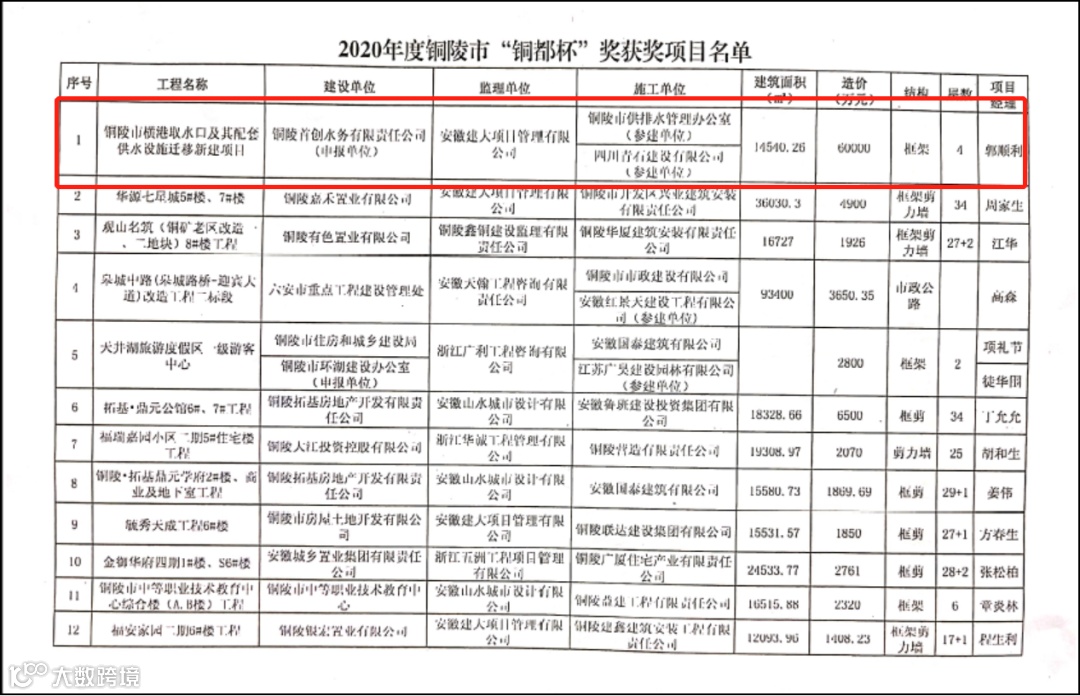 近日,市住房和城乡建设局发布了2020年度建设工程优质工程奖“铜都杯”获奖名单,建筑工程管理局发布了2020年度“优良工程”获奖名单。由铜陵首创水务公司申报的铜陵市横港取水口及其配套供水设施迁移新建项目,荣获2020年度“优良工程”、优质工程奖“铜都杯”两项奖项,成为项目荣获2019年度“市级建筑安全生产标准化示范工地”之后的又一市级奖项。