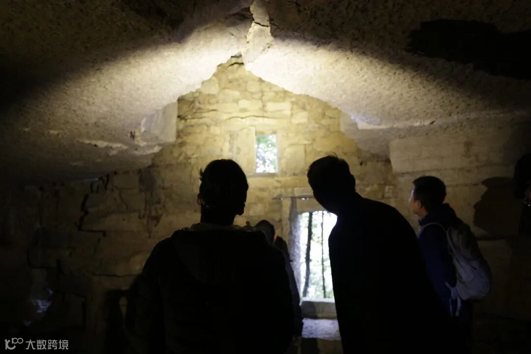 过了惊险的裂缝就有一道石门,门高1.7米宽1米左右,俯身前行约20米,有一个大厅,高约4米,面积约有200平方米。大厅正前方有人工堆砌的石墙,石墙嵌入了一个石门和瞭望窗,均以石板做门石梁做框,推开门窗自然光可径直撒向屋内。(石门窗推起来确实很重,但设计非常精密。)