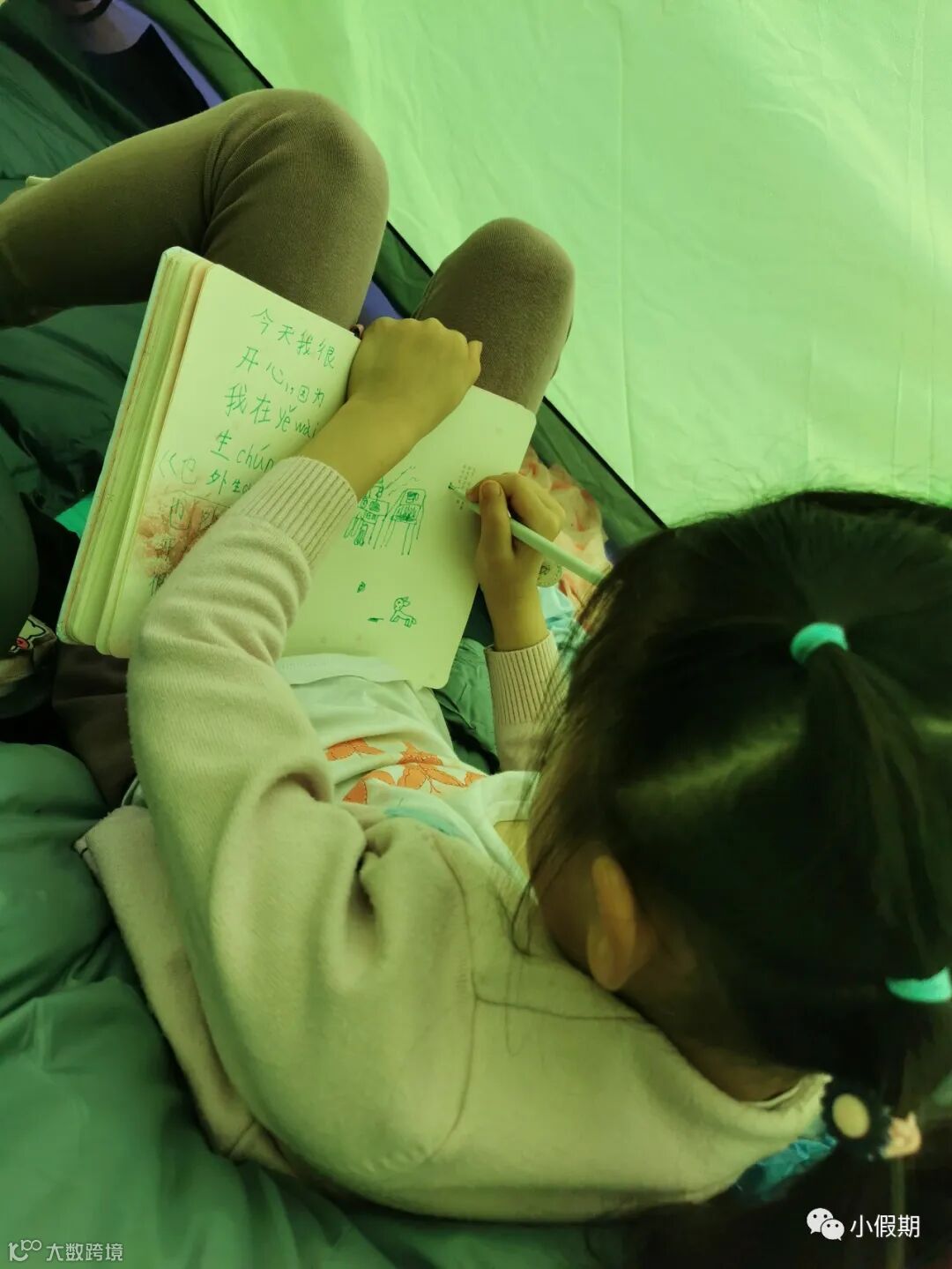 吃完早餐,我们就在帐篷里玩儿,小朋友开始写日记了,还画了烧烤的妈妈。
