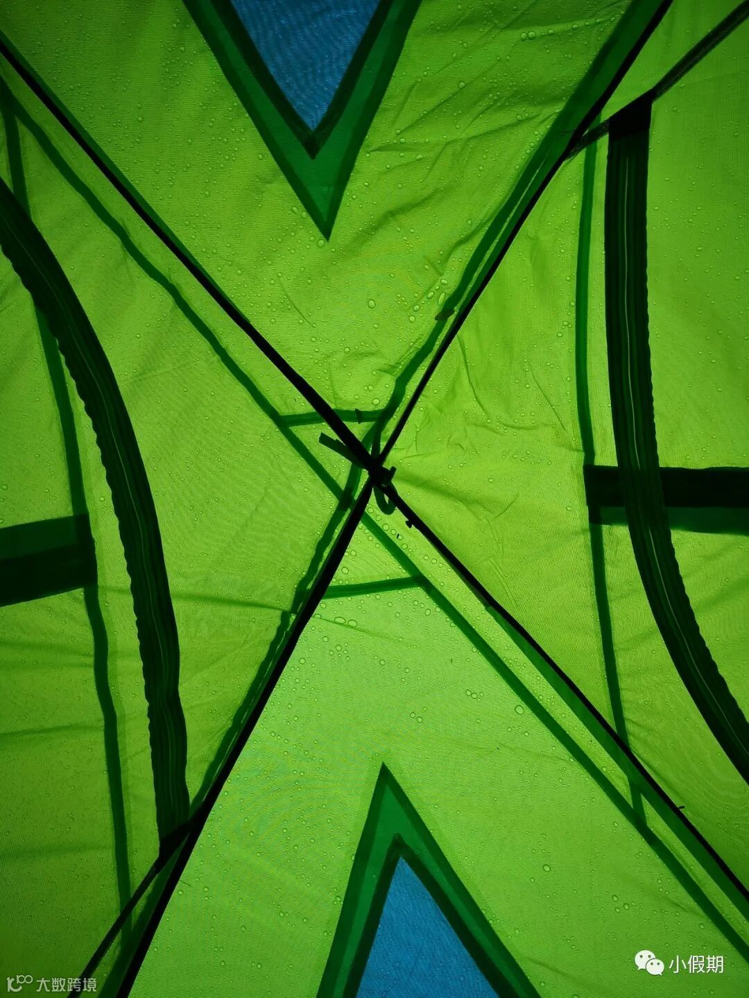 我和女儿同时醒来,睁着大眼睛,观察帐篷上面的水珠,就像荷叶上的露珠,倾盆大雨下来,分散成大颗的水珠,四散开来,我们俩都在担心,帐篷会撑不住,被冲走,没想到,它尽然一滴水都没有进来,女儿便建议,我们以后可以不花那么多钱买房子,只需要买个帐篷就好了,我觉得颇有道理。