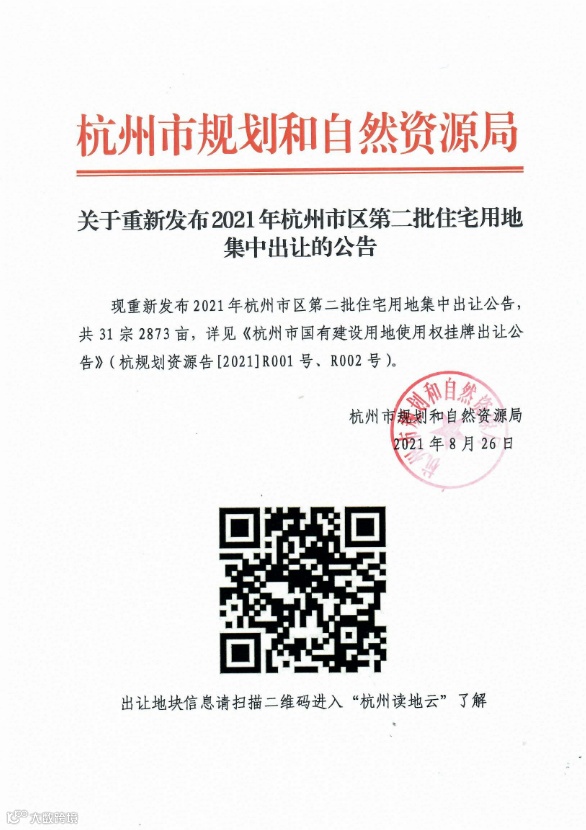 Ø 杭州规划和自然资源局:杭州市重新发布第二批住宅用地集中出让公告