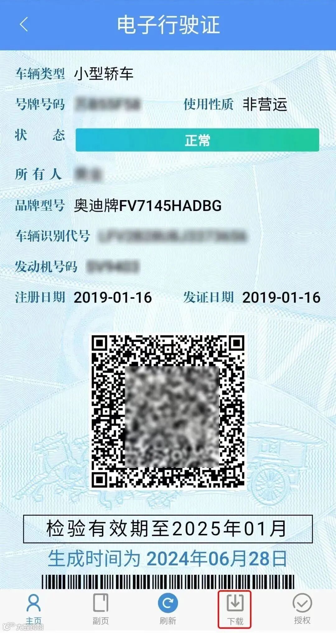 点击电子行驶证下方“下载”按钮,本人直接出示的填写用途事项和有效期后下载,授权出示的直接下载。下载的电子行驶证加注使用人、用途事项和有效期限水印,有效期最长为7个工作日。