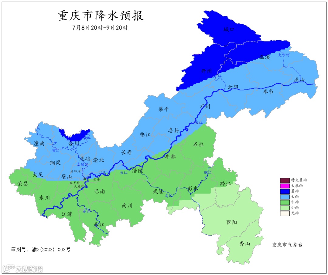 8日夜间到9日白天,长江沿线及以北地区中到大雨,合川、城口、开州、云阳、巫溪暴雨,其余地区多云转阵雨或雷雨,气温22~33℃。