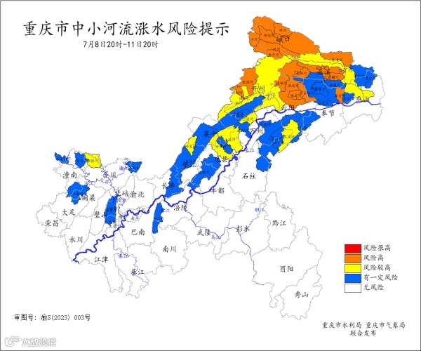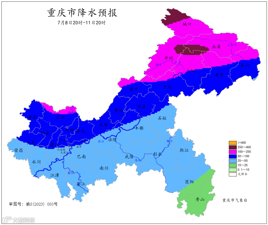 受低涡切变持续影响,预计8日夜间到11日白天,我市长江沿线及以北地区有连续强降雨,部分地区累计雨量较大,具有一定的极端性。过程累计雨量东北部地区80~180毫米,城口、开州、巫溪、云阳、奉节局地可达250~300毫米,其余地区30~80毫米,局地100~130毫米;最大小时雨量50~70毫米。降雨时伴有短时强降水、局地阵性大风、雷电等强对流天气。