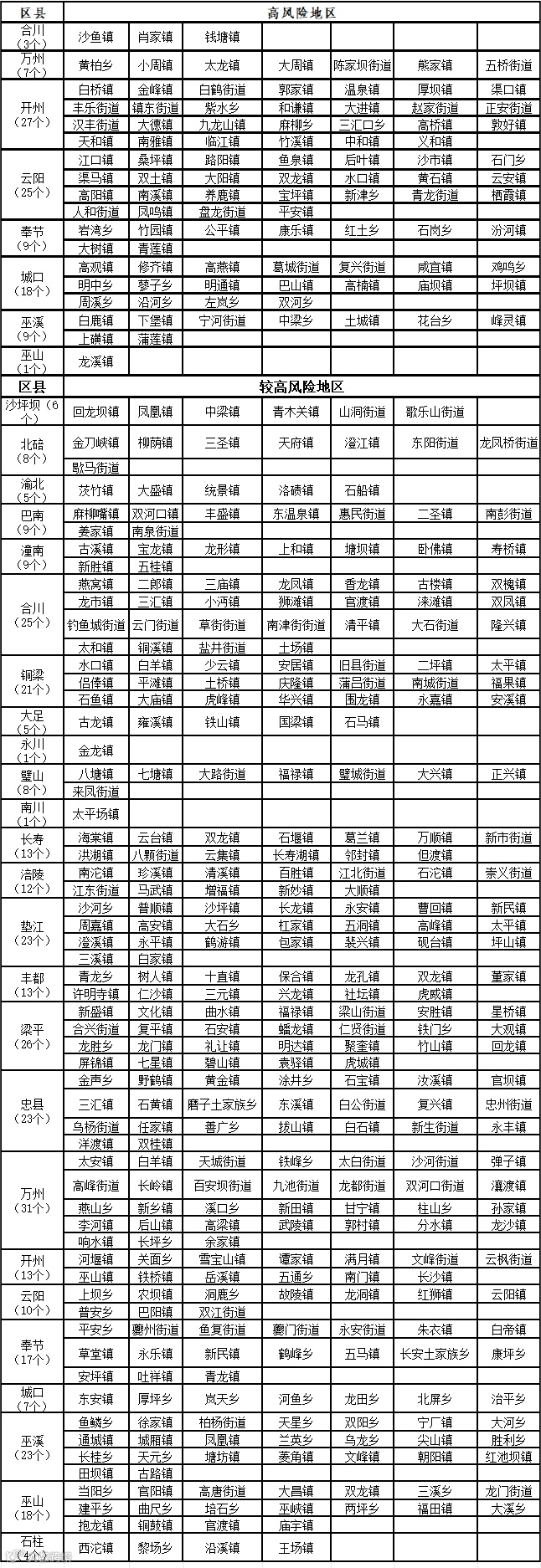 合川、万州、开州、云阳、奉节、城口、巫溪、巫山