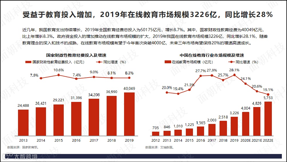 2019年我国在线教育市场规模3226亿,同比增长28.1%,随着教育理念的深入和技术的成熟,在线教育市场规模有望于今年首次突破4000亿,未来三年市场有望保持20%的增速高速成长。