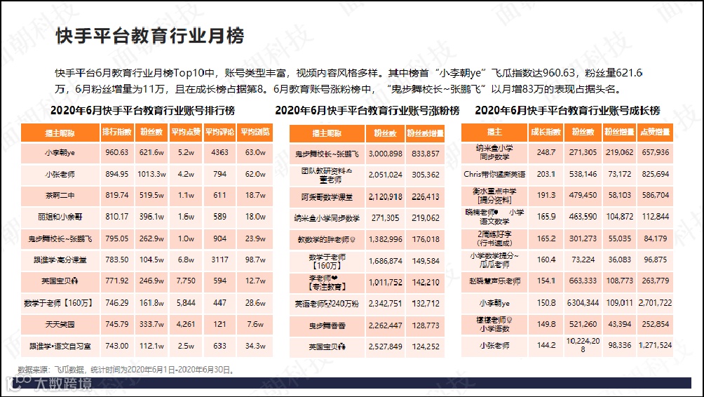 另外,关于小李朝ye、波波老师👩三四年级、鬼步舞校长~张鹏飞账号的详细分析内容,流利说、麻雀语文等品牌案例分析内容可在完整版报告中查看。(后台回复“在线教育”即可获取)