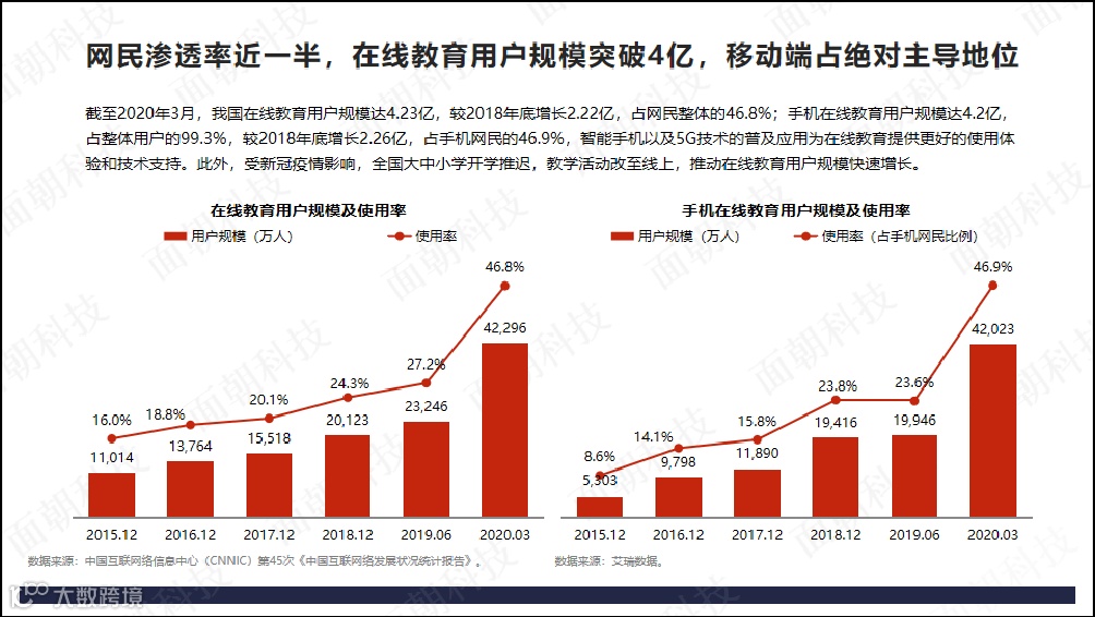 网民渗透率近一半,在线教育用户规模突破4亿,移动端占绝对主导地位。截至2020年3月,我国在线教育用户规模达4.23亿,较2018年底增长2.22亿,占网民整体的46.8%;手机在线教育用户规模达4.2亿,占整体用户的99.3%,较2018年底增长2.26亿,占手机网民的46.9%。
