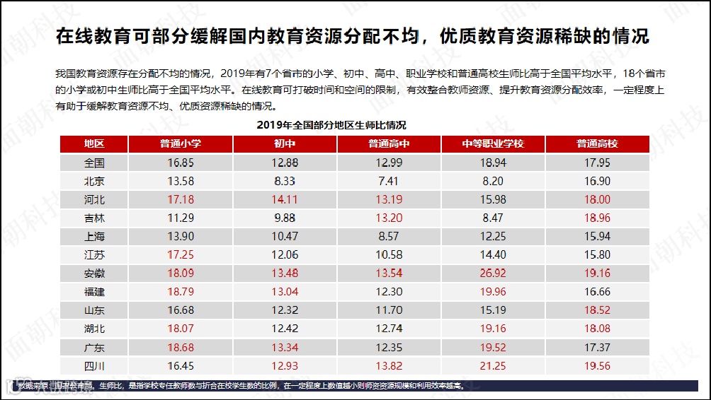在线教育可部分缓解国内教育资源分配不均,优质教育资源稀缺的情况。2019年有7个省市的小学、初中、高中、职业学校和普通高校生师比高于全国平均水平,18个省市的小学或初中生师比高于全国平均水平。