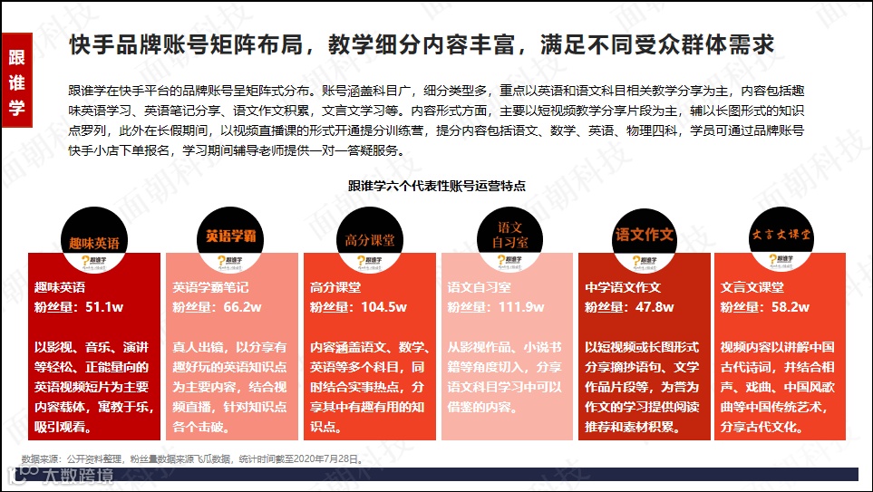 快手品牌账号矩阵布局,教学细分内容丰富,满足不同受众群体需求。跟谁学在快手平台的品牌账号呈矩阵式分布。账号涵盖科目广,细分类型多,重点以英语和语文科目相关教学分享为主,内容包括趣味英语学习、英语笔记分享、语文作文积累,文言文学习等。