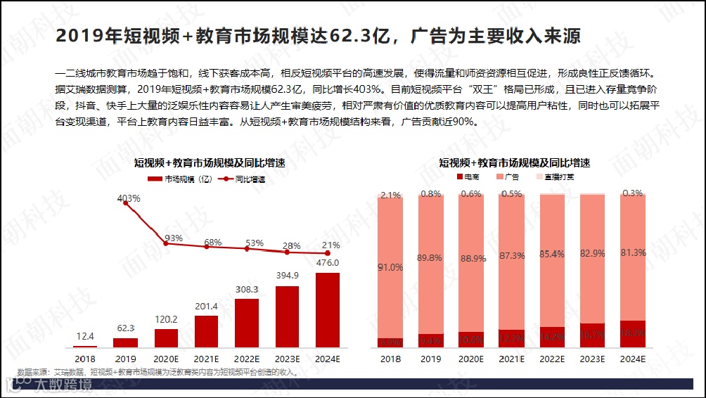 2019年短视频+教育市场规模达62.3亿,广告为主要收入来源。目前短视频平台“双王”格局已形成,且已进入存量竞争阶段,抖音、快手上大量的泛娱乐性内容容易让人产生审美疲劳,相对严肃有价值的优质教育内容可以提高用户粘性,同时也可以拓展平台变现渠道,平台上教育内容日益丰富。