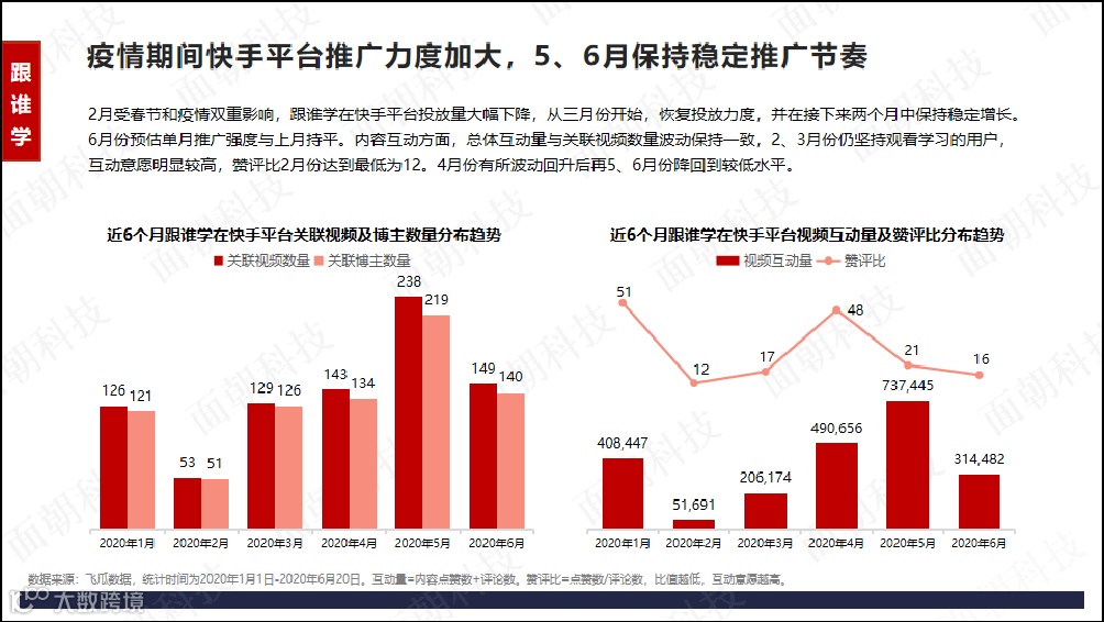 疫情期间快手平台推广力度加大,5、6月保持稳定推广节奏。2月受春节和疫情双重影响,跟谁学在快手平台投放量大幅下降,从三月份开始,恢复投放力度,并在接下来两个月中保持稳定增长。6月份预估单月推广强度与上月持平。