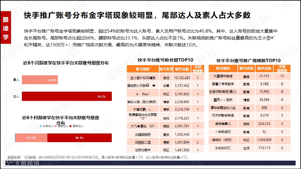 快手推广账号分布金字塔现象较明显,尾部达人及素人占大多数。快手平台推广账号金字塔现象较明显,超过54%的账号为达人账号,素人及用户账号占比45.8%。