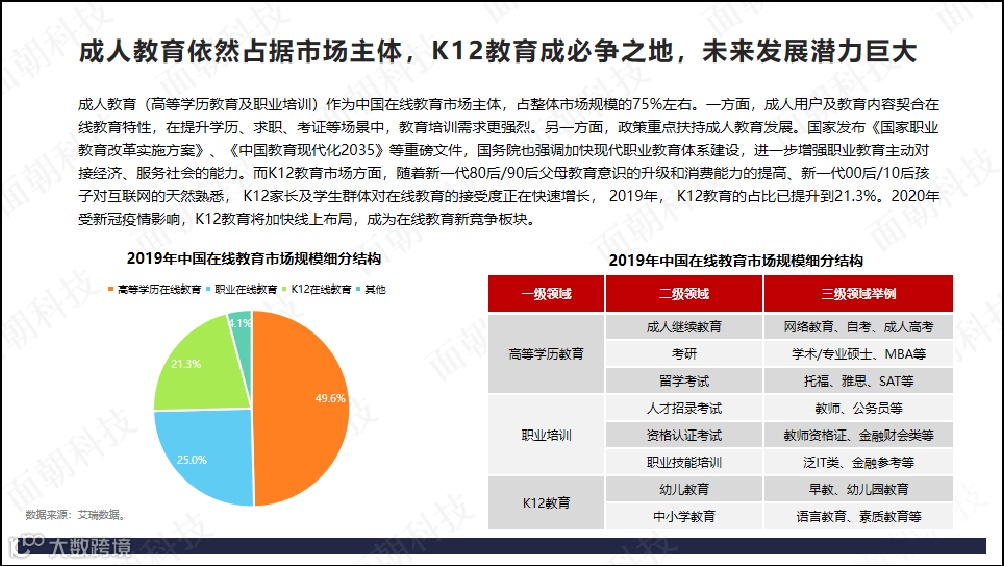成人教育依然占据市场主体,K12教育成必争之地,未来发展潜力巨大。成人教育作为中国在线教育市场主体,占整体市场规模的75%左右。