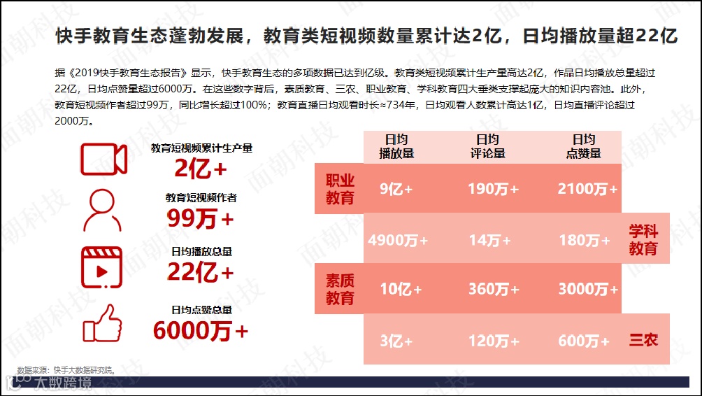 快手教育生态蓬勃发展,教育类短视频数量累计达2亿,日均播放量超22亿。据《2019快手教育生态报告》显示,快手教育生态的多项数据已达到亿级。教育类短视频累计生产量高达2亿,作品日均播放总量超过22亿,日均点赞量超过6000万。