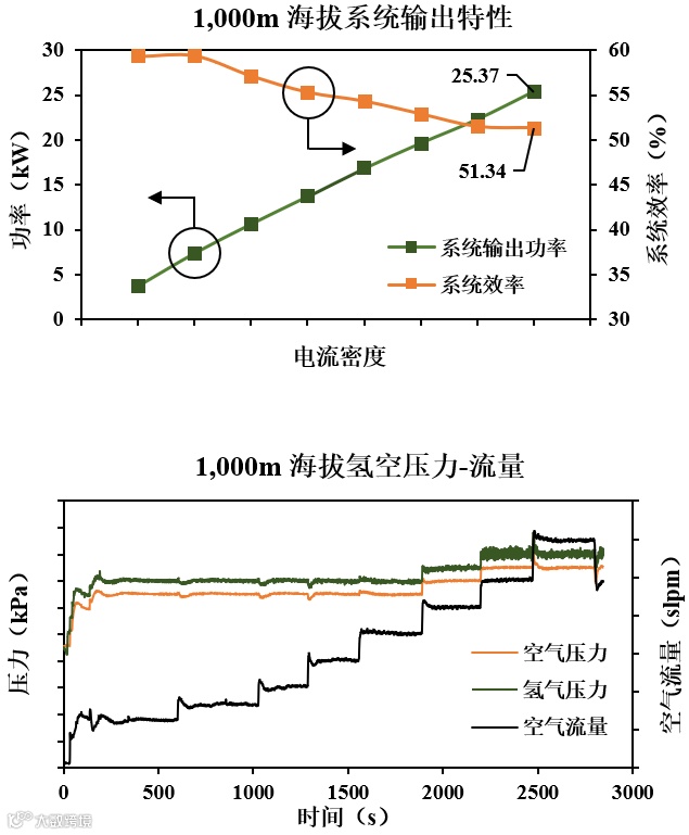 测试结果令人振奋:在0-5,000米不同海拔高度下,YQ-LC30燃料电池系统始终实现关键参数的精准控制,系统运行高效、稳定,输出功率与响应特性表现优异。即便在5,000米高原极限环境下,依然能够维持额定电流密度输出,仅出现预计范围内的轻微效率波动,性能衰减率大幅优于同类产品。