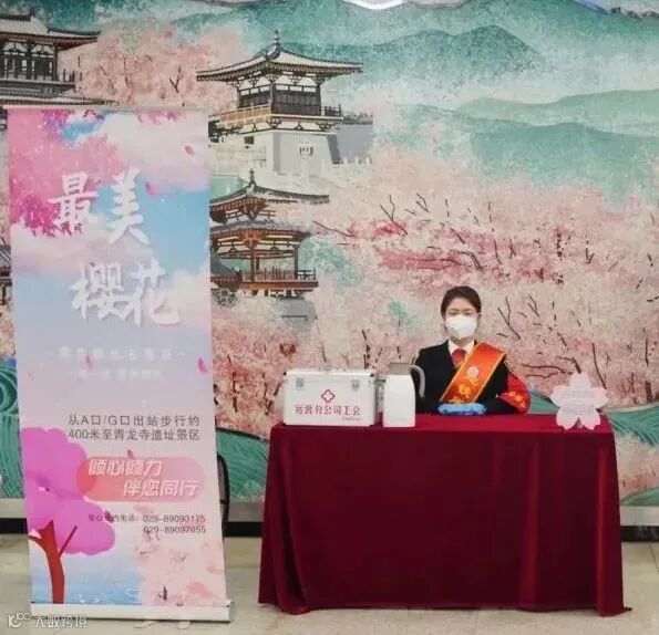 今年西安地铁青龙寺站特意开展了“青龙观樱,AI伴您行”主题服务活动,为乘客提供赏樱指引及问询服务,并常备爱心轮椅、爱心手推车、爱心医药箱等便民设施。
