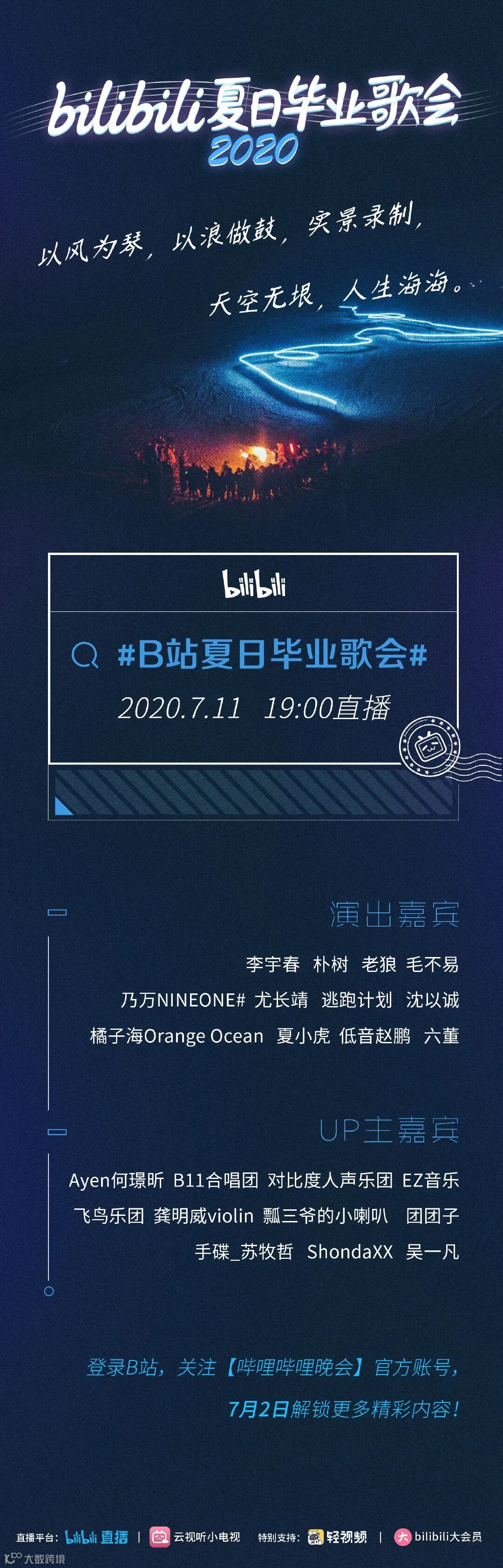 B站将在海边举办一场“bilibili夏日毕业歌会”。根据官方海报,本次歌会参演嘉宾包括李宇春、朴树、老狼、毛不易、逃跑计划等歌手及乐队。此外,B站音乐区UP主“龚明威violin”、“SealWu吴一凡”等也将参与其中。毕业歌会将于7月11日晚19点通过B站“哔哩哔哩晚会”官方账号直播。