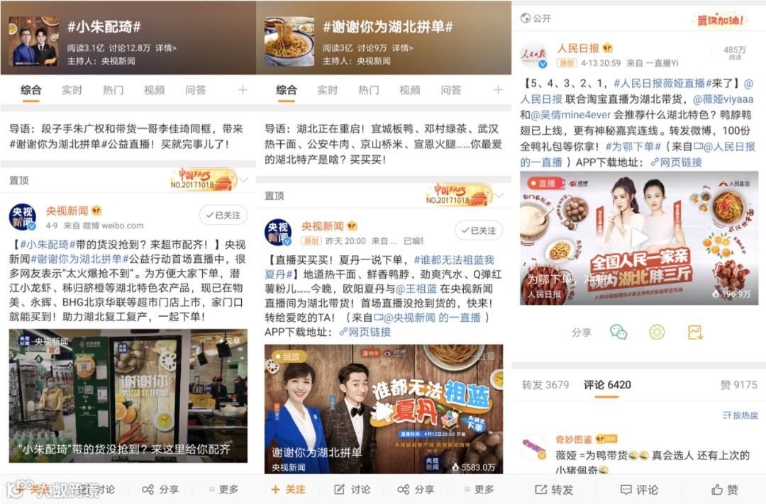 央视新闻牵头打造#谢谢你为湖北下单#的话题内容,持续在淘宝直播和快手平台推出「小朱配琦」和「谁都不能祖蓝我夏丹」的央视主播带货组合,以及人民日报推出薇娅跟明星结合打造话题专场,都加速了直播向内容的转变。