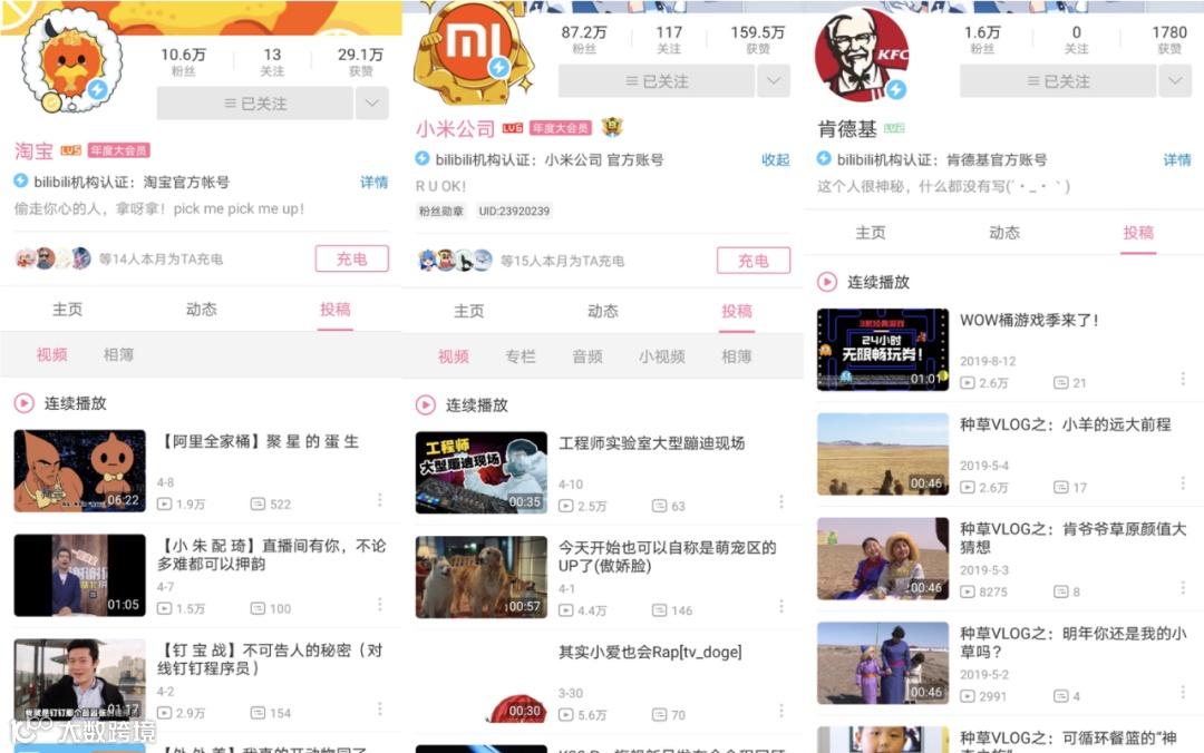 品牌在B站的推广有两种方式,官方账号入驻,例如小米、阿里系和肯德基等均在B站有自己的官方账号。直播或跟up主合作,运用B站的原生产品进行内容植入。