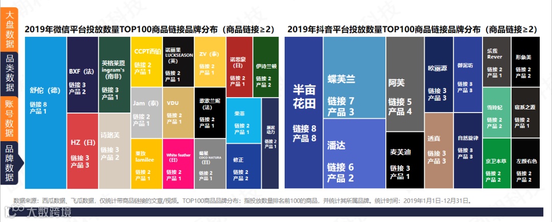 微信多为国外品牌,抖音多为国产新锐品牌,半亩花田推广产品最多