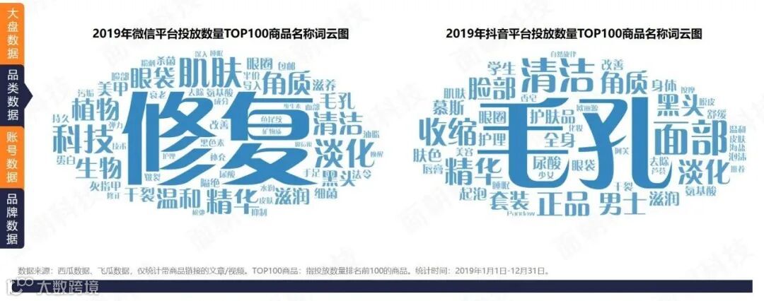 护肤品类在微信、抖音投放的商品名称词云中,突出产品功效性为主,“修复”“清洁”“淡化”“毛孔”“角质”等词出现频次较高,多以基础护肤产品为主,主要针对面部护理。抖音产品目标用户更细分,“男士”“学生”等词出现频次较高。