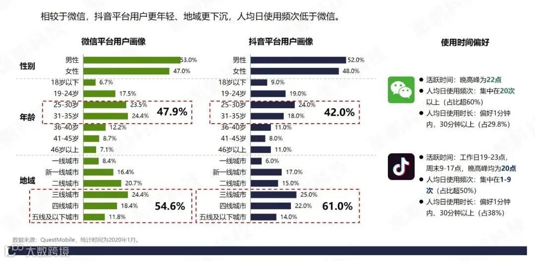 根据两个平台的用户画像,从年龄上看,微信25-35岁用户群占47.9%,抖音占42%,从地域上看,三线及以下城市微信用户占54.6%,抖音占61%,从使用时间偏好来看,微信用户活跃时间在22点,而抖音则在19-23点。相较于微信,抖音平台用户更年轻、地域更下沉,人均日使用频次低于微信。