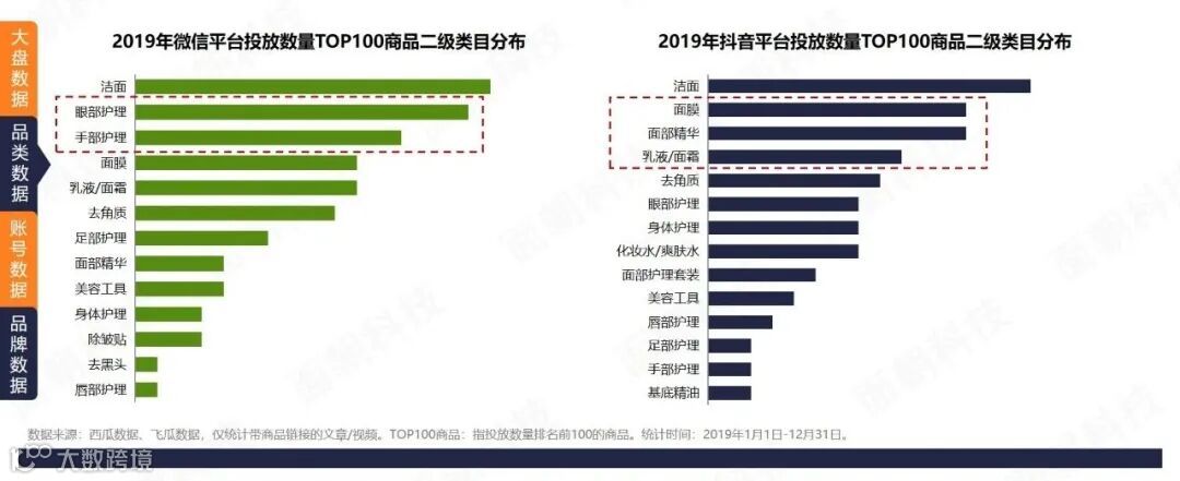下面以护肤类为例,从大盘数据、投放品类、投放账号、投放品牌四方面对比分析微信、抖音在护肤赛道上的表现。