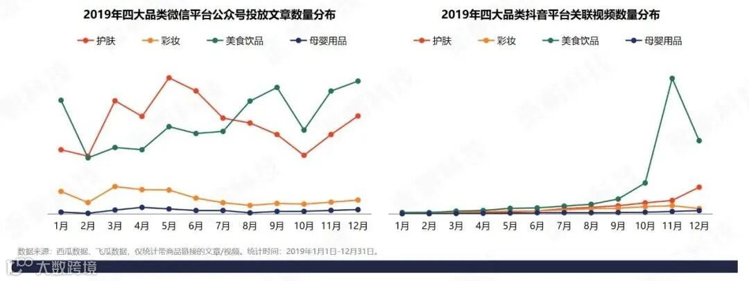 2019年四大品类微信、抖音投放趋势分布中,在微信公众号上,美食饮品类商品在1月、8-12月投放数量最大,护肤类商品在3-7月投放数量最大,而彩妆、母婴类商品投放集中在3-5月;在抖音平台上,四大品类投放均呈上升趋势,美食饮品类商品投放数量最大,11月达到峰值,投放量最大。美食饮品季节性投放规律显著,主要集中在四季度和1月(年货节)期间。