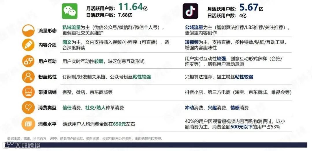 根据互联网公开资料整理,微信与抖音在流量形态、内容介质、用户互动、粉丝粘性、带货店铺、消费类型、消费水平等方面均存在着差异,这也导致两者的平台带货属性不同,对应的是两套不一样的玩法。