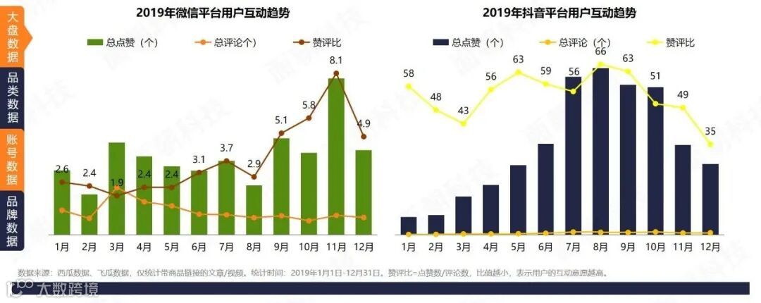 护肤类商品微信投放文章用户总点赞数、赞评比数均在11月(双十一大促)达到峰值,用户对商品促销相关内容关注度较高,同时大量营销内容也降低了用户互动欲望,因此赞评比达到全年最高。护肤类商品在抖音投放视频总点赞数逐月增长,7-10月总点赞数最高,11、12月赞评比较低,用户互动意愿较强。