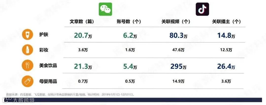 ●微信平台,护肤、彩妆以国外品牌为主,美食饮品以中医古方养生品牌为主,母婴用品以驱蚊防晒类品牌为主;抖音平台,护肤、彩妆以国产新锐品牌为主,美食饮品以中医古方养生、麦片、调料品牌为主,母婴用品以洗护类品牌为主。
