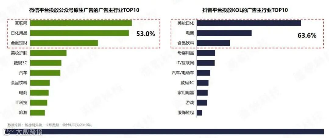 平台投放KOL广告主行业分布,不同行业广告主对微信、抖音平台的投放偏好不一致。互联网、快消、金融行业偏好在微信投放公众号原生广告,占比超53%;而美妆日化、电商、食品饮料行业偏好在抖音投放KOL,占比超63.6%。