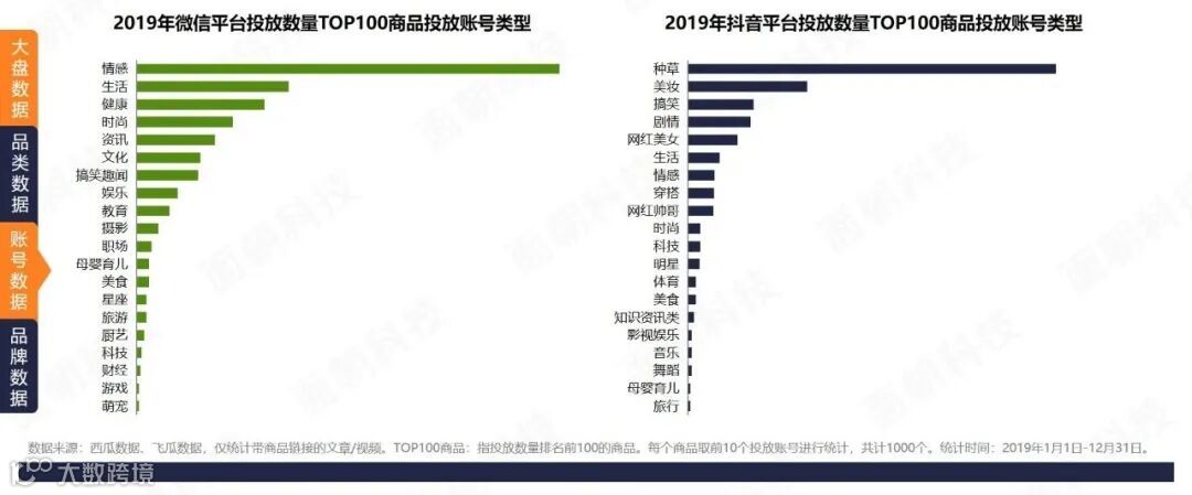 微信平台投放以情感账号为主,抖音平台投放以种草账号为主