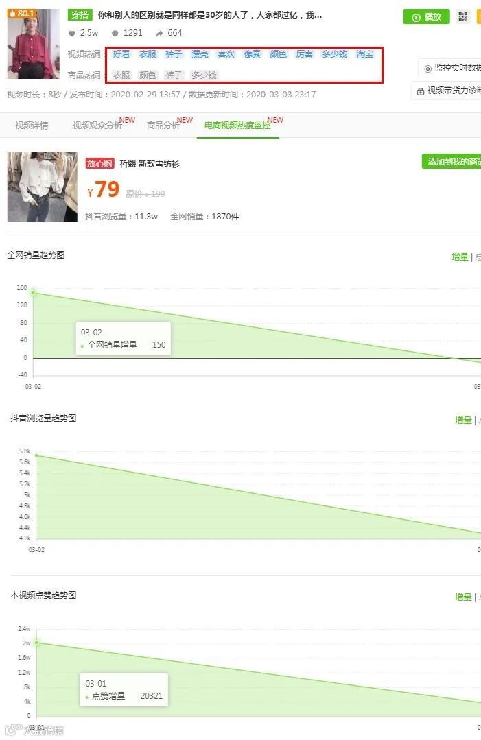 我们通过【播主视频】可以定位到“雪纺衫”的流量增长主要来自「哲熙服装」2.29发布的视频,在【电商视频热度监控】发现这个视频点赞来自3.1,当天点赞增量达到2万。