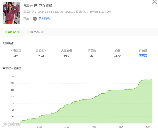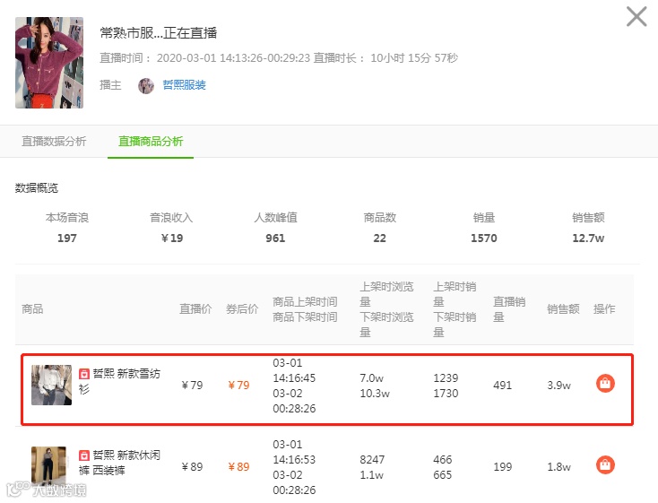 我们可以看到「哲熙服装」从2点开始直播,直播间的最高在线人数是961人,在10个小时的直播时间内,销售额达到了12.7万,那么究竟他的直播间在卖什么商品呢?
