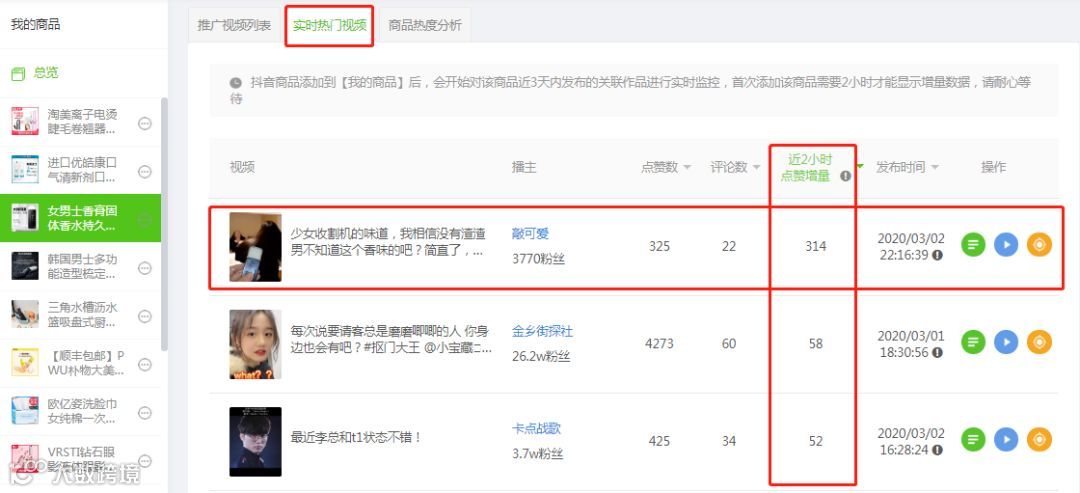 在飞瓜数据新上线的【我的商品 - 实时热门视频】中,可以查看关联商品视频近2小时的点赞增量数据。