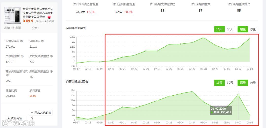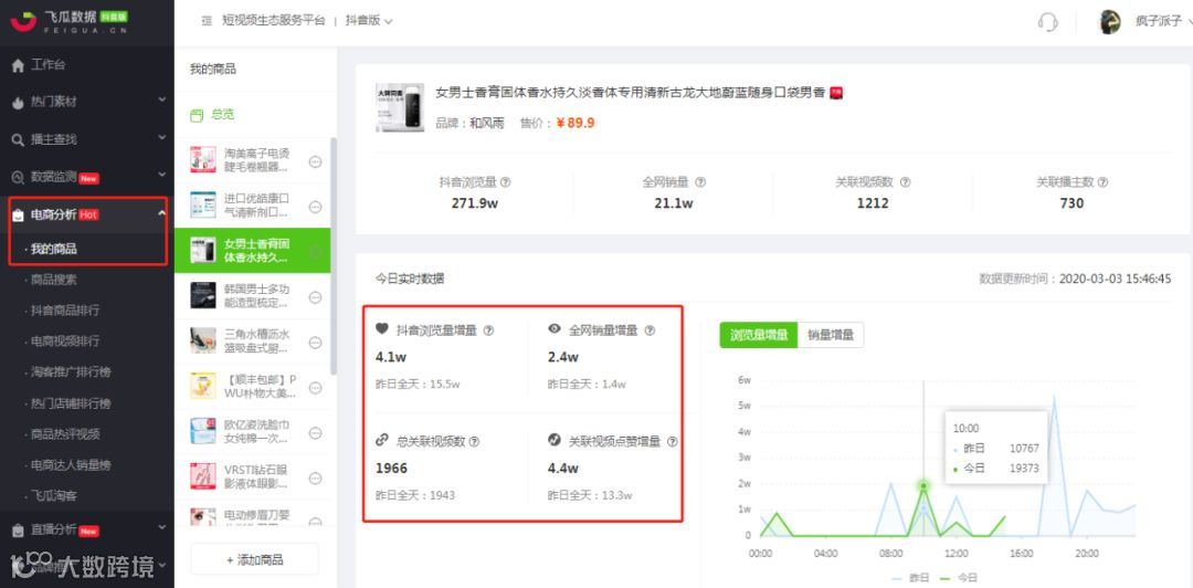 加入【我的商品】后,系统将更快更新商品的关联视频,并实时监控商品今日关键数据,我们可以看到“固体香膏”今日浏览量增量超过了4.3万,销量增加了2.4万单,说明商品还在持续爆单。