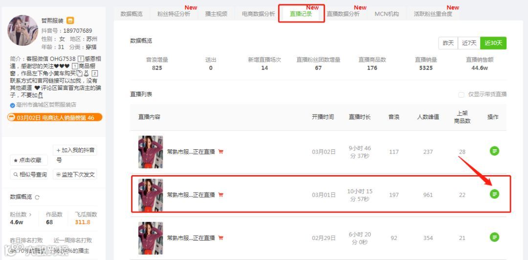 我们发现29号视频爆火之后,3.1直播间的人数峰值最高,我们可以点击右侧的“详情”查看该场直播的历史数据。