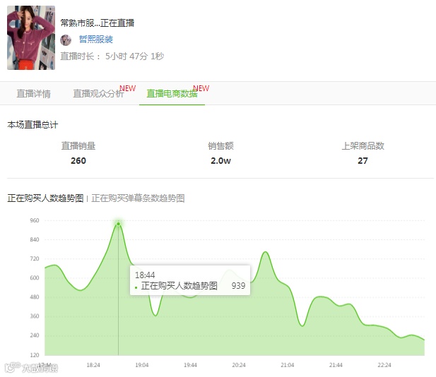 我们通过飞瓜数据的【直播监控】可以看到「哲熙服装」这场直播最终的预估销量额2万,那么究竟是什么时候达到销量峰值呢?