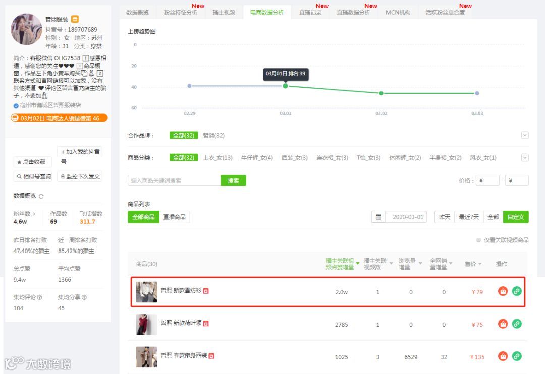 我们可以看到「哲熙服装」关联的商品都是服装类,是一个非常垂直的服装号,在3.1电商视频的主要增量来自“雪纺衫”的推广视频,而其他带货视频并没有明显增量。