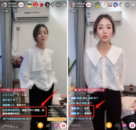 我们发现在7点的时候「哲熙服装」直播间出现了大量的“正在购买弹幕”,这就是说明他当时讲解的商品引发了很多用户的点击购买。