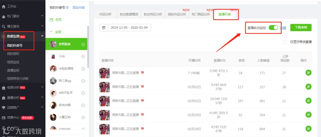 同时,如果想要自动监控「哲熙服装」的直播带货记录,只需要将账号加入【我的抖音号】,在【直播列表】中,可以设置直播自动监控。