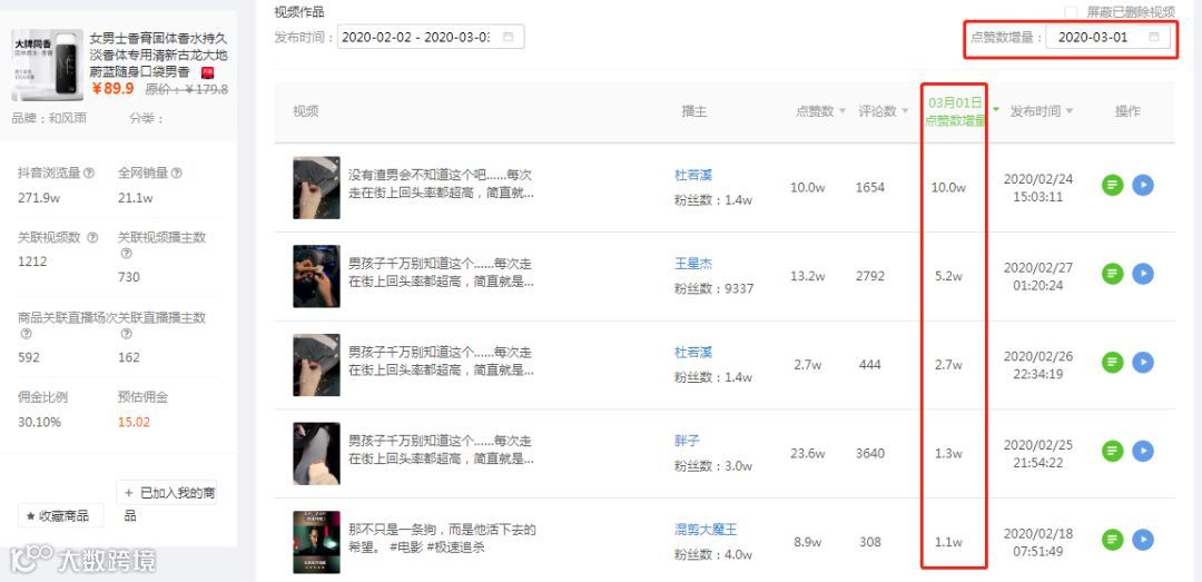 接下来,我们以近期推广视频增量最多的3.1号为例,通过飞瓜数据查看该商品的【关联视频分析】,我们可以选择查看近30天内视频当日的点赞增量,精准定位热门商品爆火当天的带货视频。