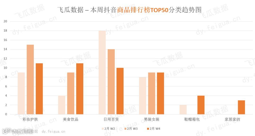 通过飞瓜数据上周的商品排行TOP50数据中,我们可以看到最近彩妆护肤、美食饮品、日用百货依旧是抖音上热销品类,商品销量也在持续增长;服装类商品保持着稳定增长,不少服装号开始入场直播带货。