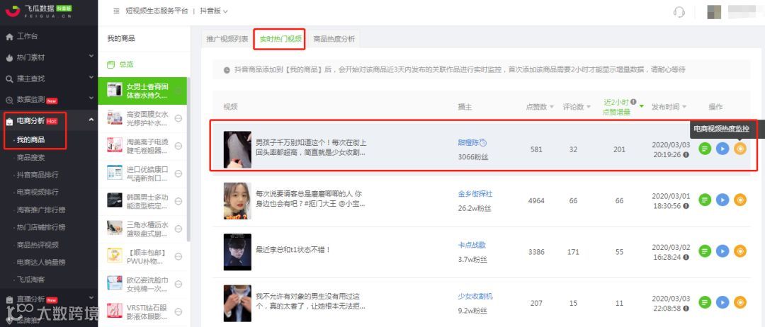 △图片来自:飞瓜数据 - 我的商品 - 实时热门视频